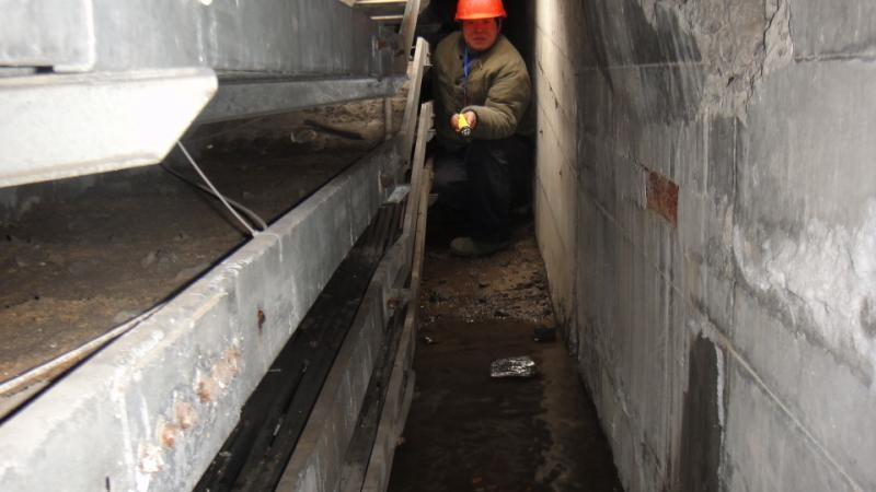 2、等到消防水池内的水全部放完后,将池内阴角处抹成圆弧,并对池壁进行检查,对不平整部位用1:1水泥砂浆抹平,待砂浆达到一定强度后用,涂刷JS防水涂料或粘贴卷材,粘贴卷材时要求满粘,不得有气泡,卷材搭接长度不得小于100mm。南侧和东侧池壁满铺防水材料,施工时在池底和顶部各铺设300mm宽的防水材料。由于消防水池池壁较高,且不通风、较潮湿、防水材料含有毒物质等原因,故施工时必须有鼓风机鼓风,且不得连续施工两小时以上,以免发生意外。
